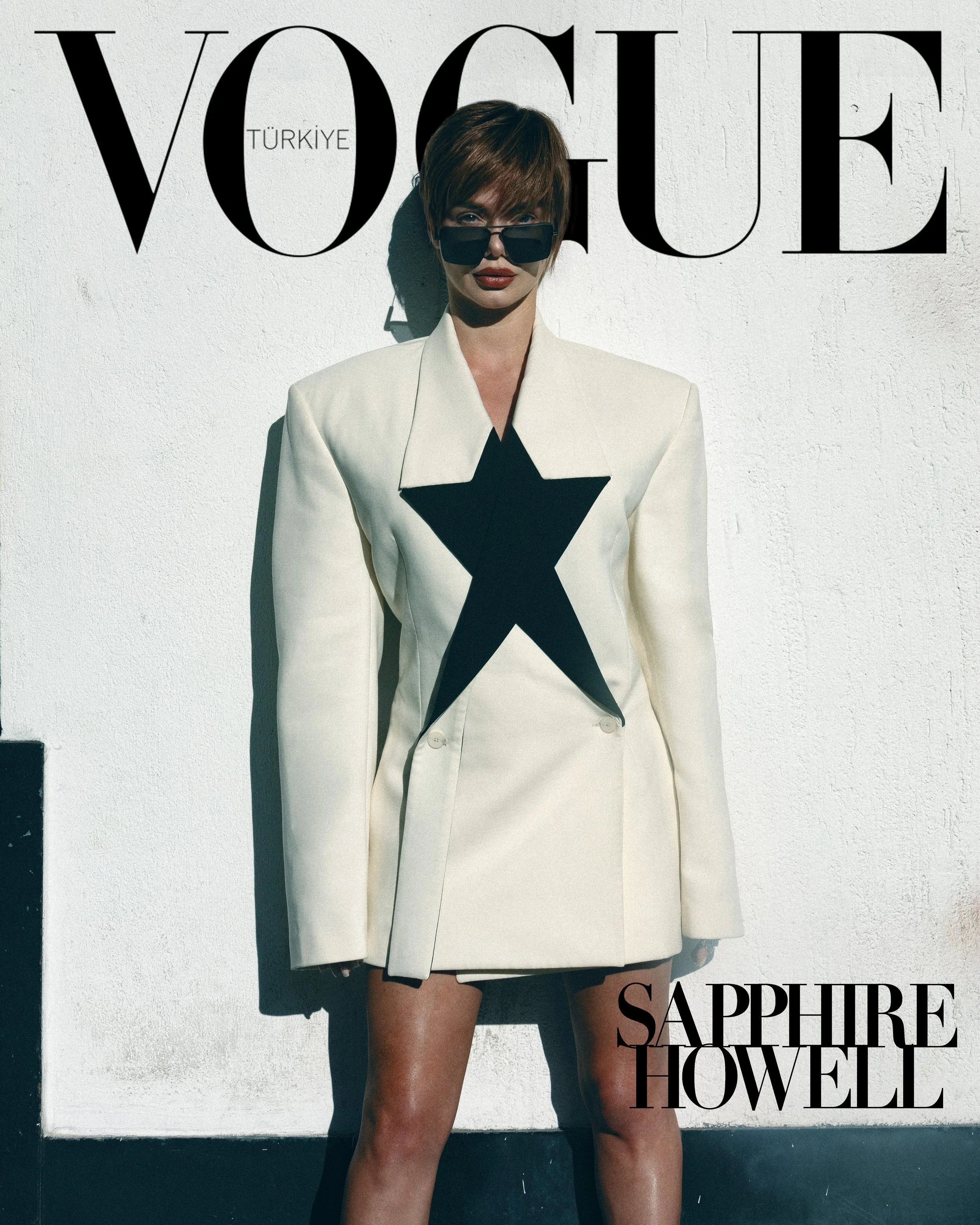 A woman with short brown hair and dark sunglasses wearing a white blazer with a large black star on the front. She is standing against a white wall with the 'VOGUE TÜRKİYE' logo at the top and 'SAPPHIRE HOWELLE' at the bottom. View fullsize
