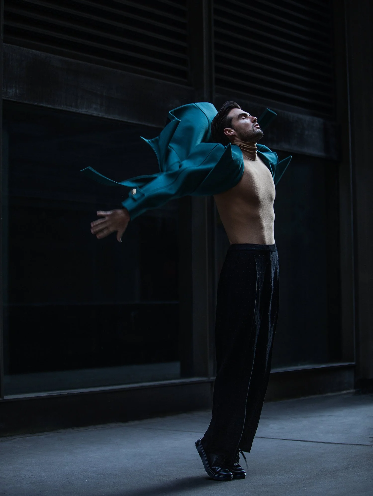 Model wearing a red quilted jacket and black pants with shiny black accents, posing against red velvet curtains.